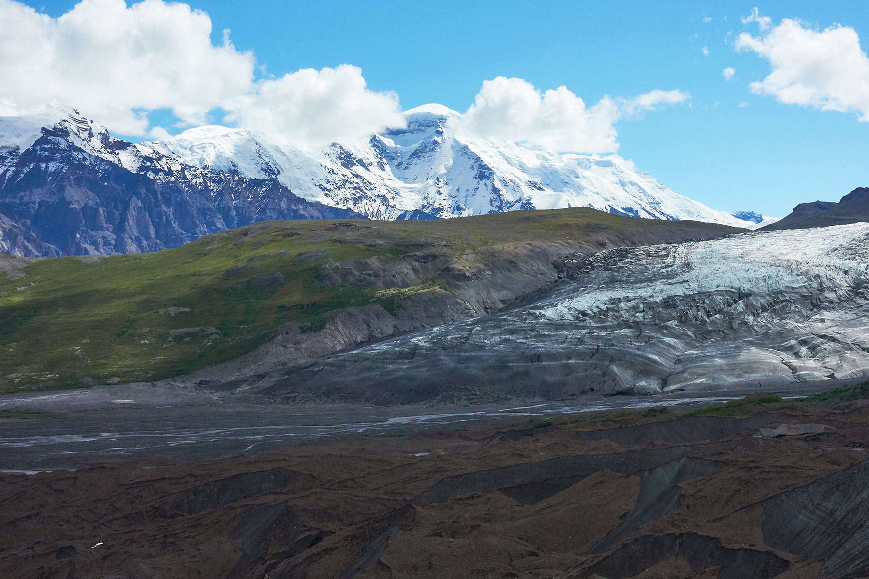 The rugged peaks of the Wrangell Mountain Range encircle this place.